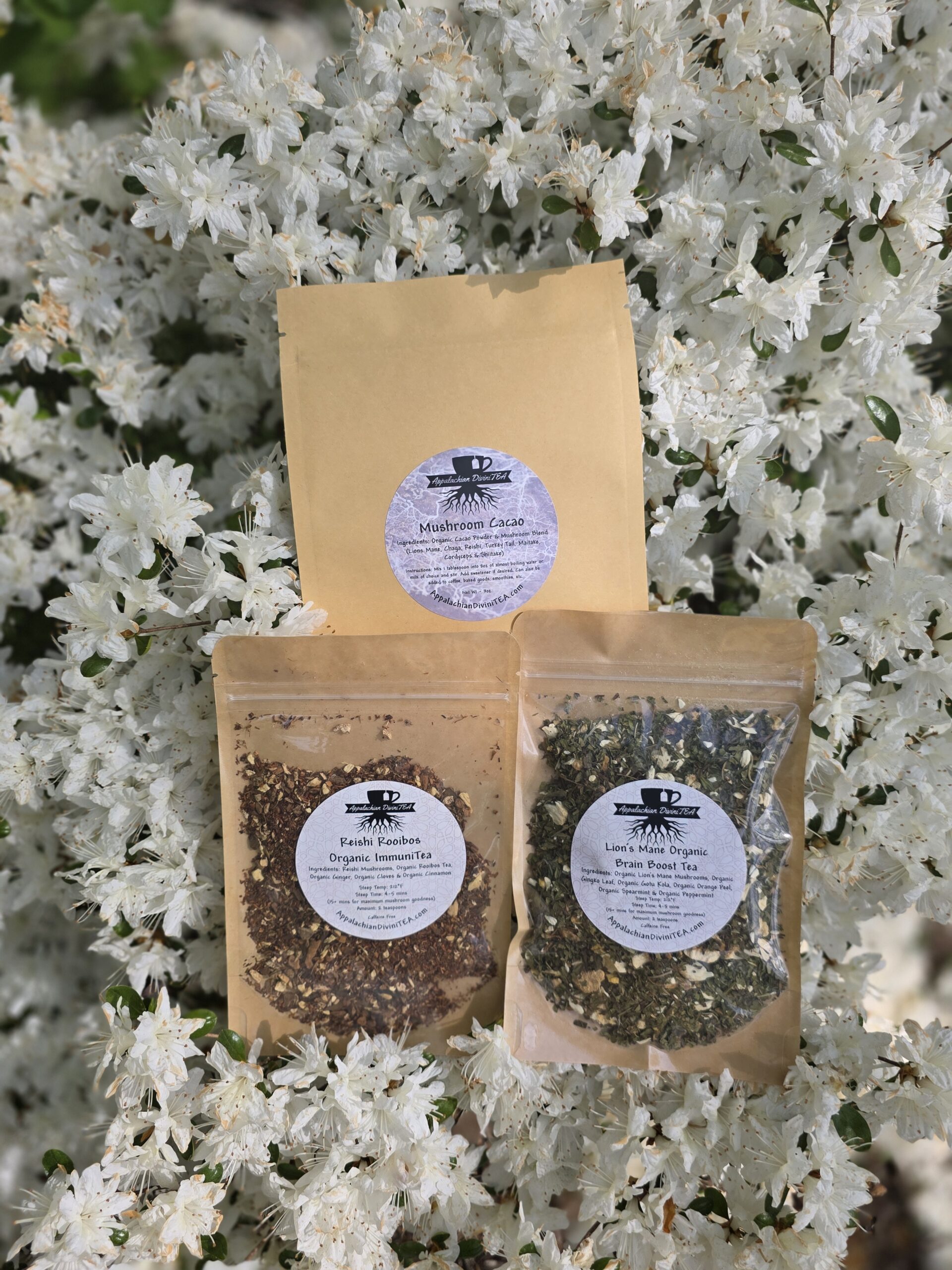 This Appalachian DiviniTEA Trio Bundle brings together our three best selling mushroom blends, handcrafted in small batches in the heart of the Appalachian Mountains. Each blend is thoughtfully crafted with 100% certified organic botanicals and locally foraged mushrooms when possible – to taste good, and to be good for you.