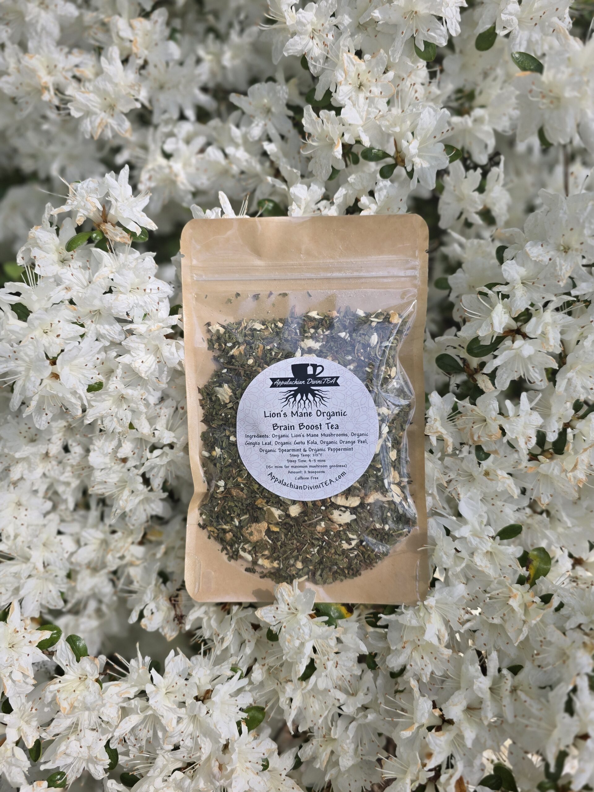 Ingredients: Organic Lion’s Mane Mushroom, Organic Gingko Leaf, Organic Gotu Kola, Organic Orange Peel, & Organic Peppermint