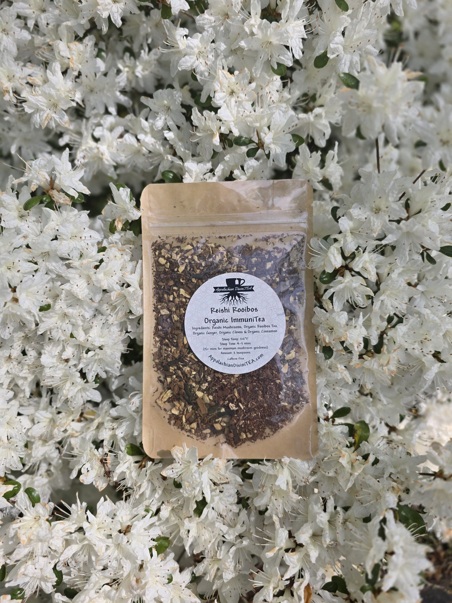 Ingredients: Wildcrafted Reishi Mushrooms, Organic Rooibos Tea, Organic Ginger, Organic Cinnamon, & Organic Cloves